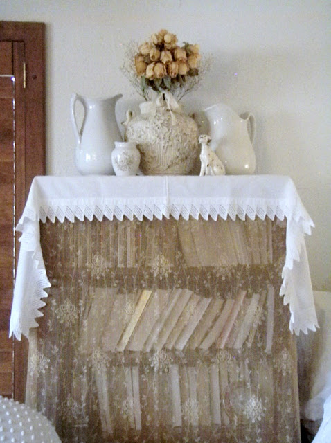 Good morning! Just saw this post and as always, love what you are showing. Now about that lace covering the books....I LOVE that! And, I would have it in my living room I love it so much. Don't you think it also cuts down on the dust on your books? I'd think so. Always amazed at what you think up!! Thanks, pat