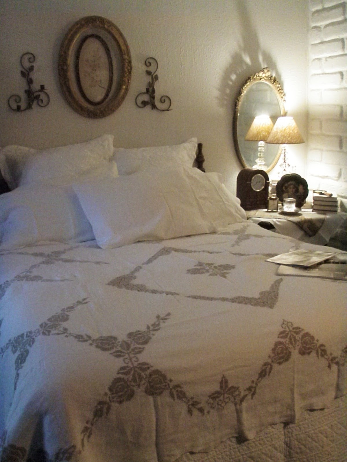 I love your collection of vintage and new linens and how you change them out so frequently. I've been working on neutralizing the linens on a guest bed, and I just haven't found the satisfying combination yet. Love the doily on your lampshade! I have lots of doilies that my mother-in-law gave me.