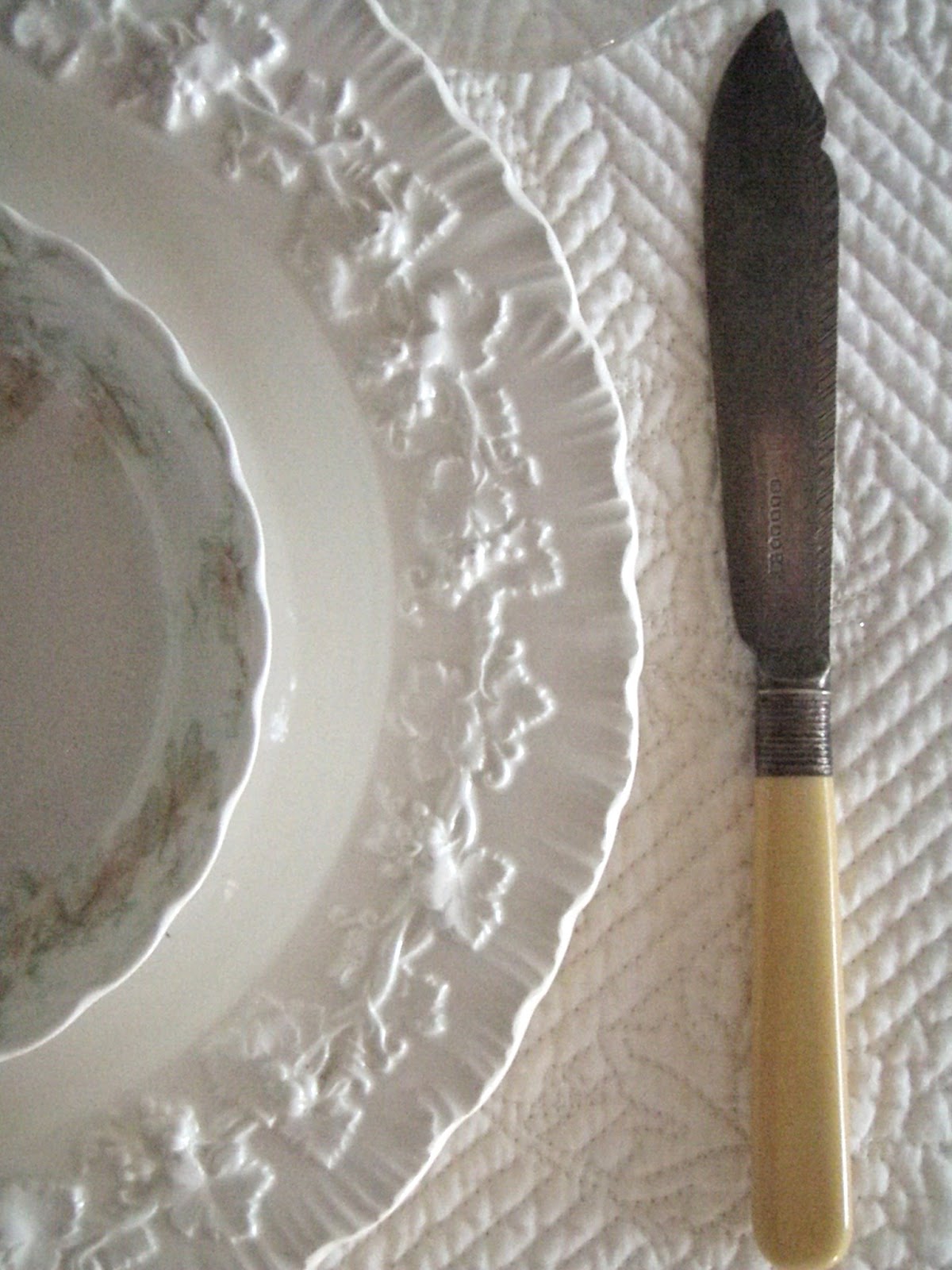 OOh what artistry. I love that tablecloth. But alas, none of the good stores here. bummer, so no sales. You scored with this one. I do like how the handles of the fish knives play with the colors in the tablecloth. The flowers and limoges plates are fabulous too. So serenly perfect! Be blessed, xo marlis