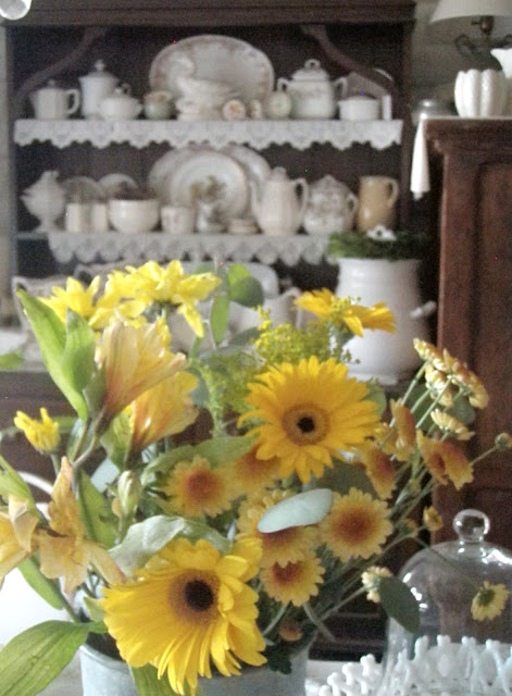 I think this has to be my most favorite of all your posts. Those flowers are gorgeous,love the yellow. I always fill the front of my home with yellow, apricot and white flowers during the Fall. Can't wait. I love the Fall and it has been so hot this summer that I really don't mind letting it go. There is that magnificent hutch with all those gorgeous white dishes. Oh, you are a tease. I want to touch and play with them. So, so beautiful.