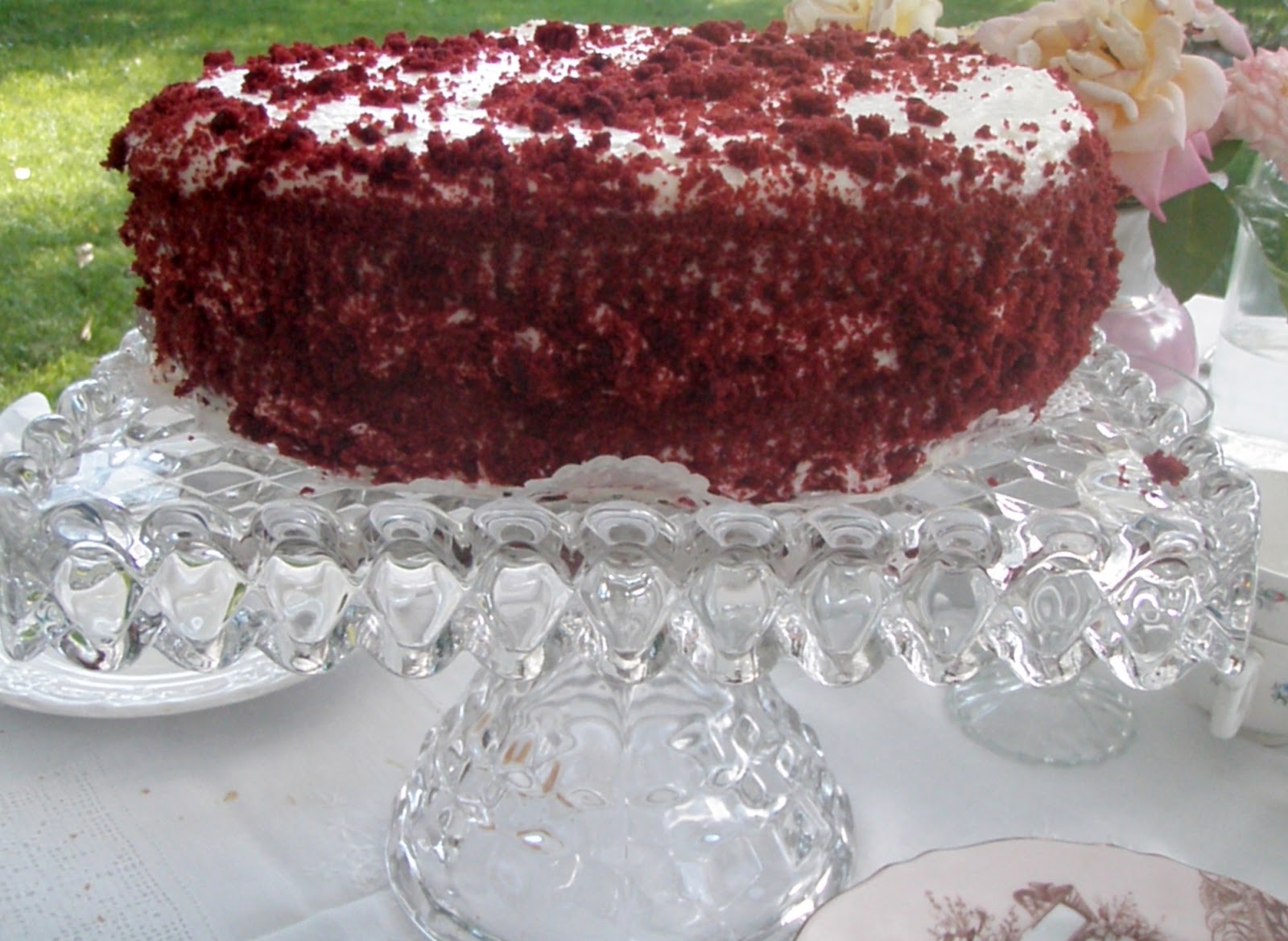 Romantic ruffles adored with romantic lace. China tea cups. Red velvet cake. White adored with roses in a pitcher. This "Garden Party" is equalivent to a scene from Out of Africa! Lovely post! Rain. . .lovely ending!