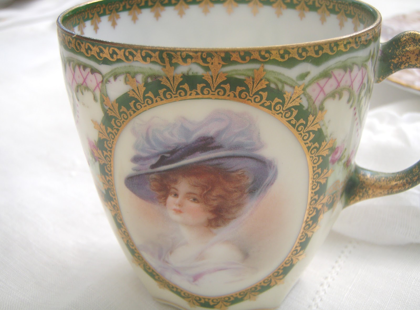 Oh just perfect in every detail! The breezy white lace, and lush lush green lawn... mix match dishes, casual elegance at it's best! Delicious! Love the Gibson girl mug, so much detailing!
