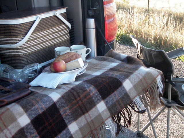 How lovely! I love the whole scene and the gorgeous wilderness scenery as a backdrop. Thanks for sharing your tail gate picnic with us.
