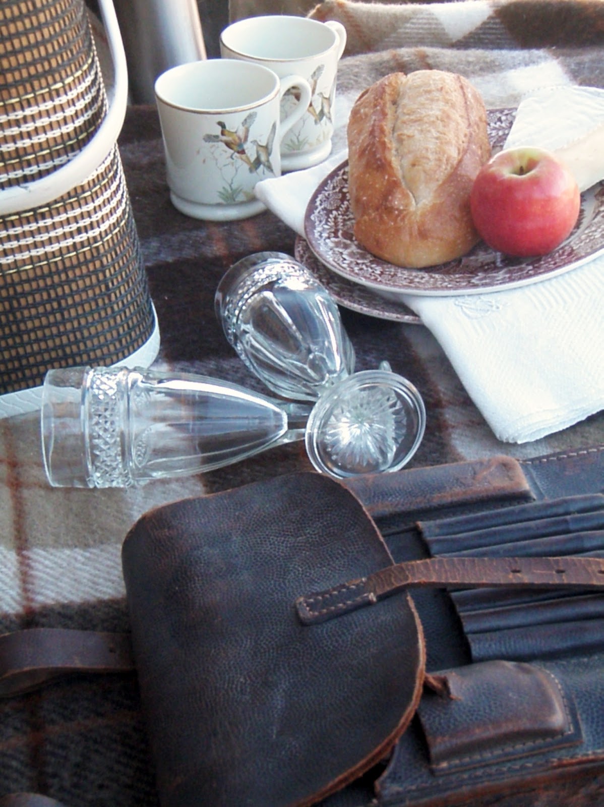 That is my kind of tailgating! Beautiful scenery! Love that blanket,picnic basket and cups too!