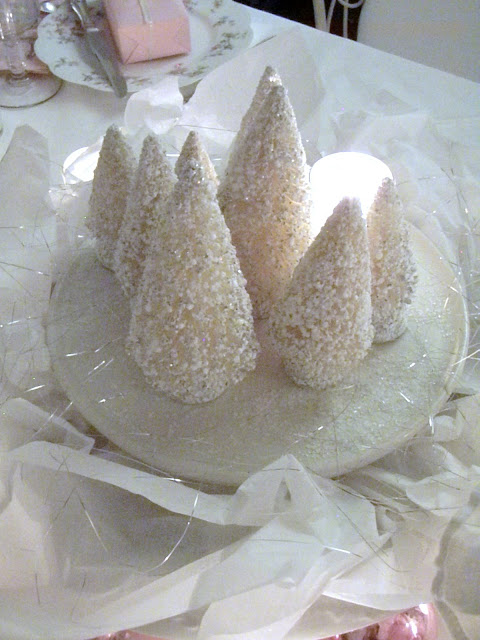 A little coarse sparkling sugar, and a bit of tinsel on the base of my bottle tree forest finishes it off. White tissue fills in between the cake stand and a large ironstone basin. All we need now are a few tidbits and the fairies!
