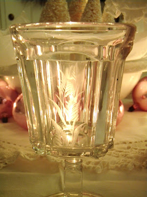 I love the glitter church. So perfect with your white trees, linens, and pink ornaments and china.
