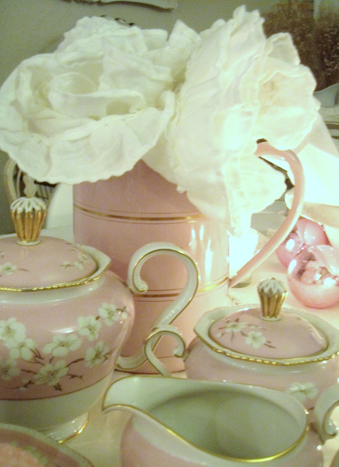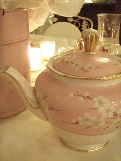 So much eye candy in this post, Jacqueline--I love the vintage linens and lace, the napkins folded into roses, and the gorgeous pink teapot set! I enjoyed hearing from you over at my blog, and am so glad that you enjoyed my holiday mantel--thank you, and I hope your day today is wonderful!