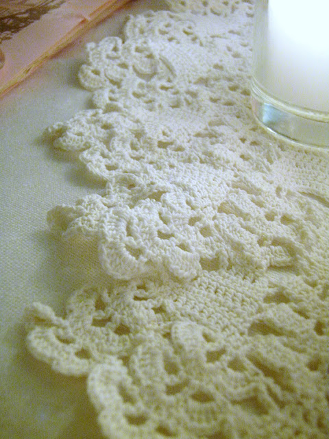 A small vintage lace-trimmed linen round anchors the center and adds a bit more detail. I love the look of layered white linen!