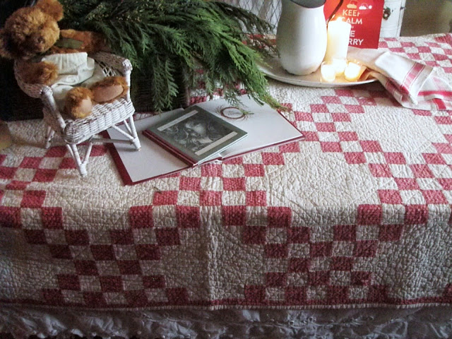 I'll take Scrooges advice and try to "live in the Past, the Present, and the Future . . . and will not shut out the lessons that they teach." I'll keep adding a bit of cheer here and there, like I did with this vignette from last year, and the same vintage quilt.