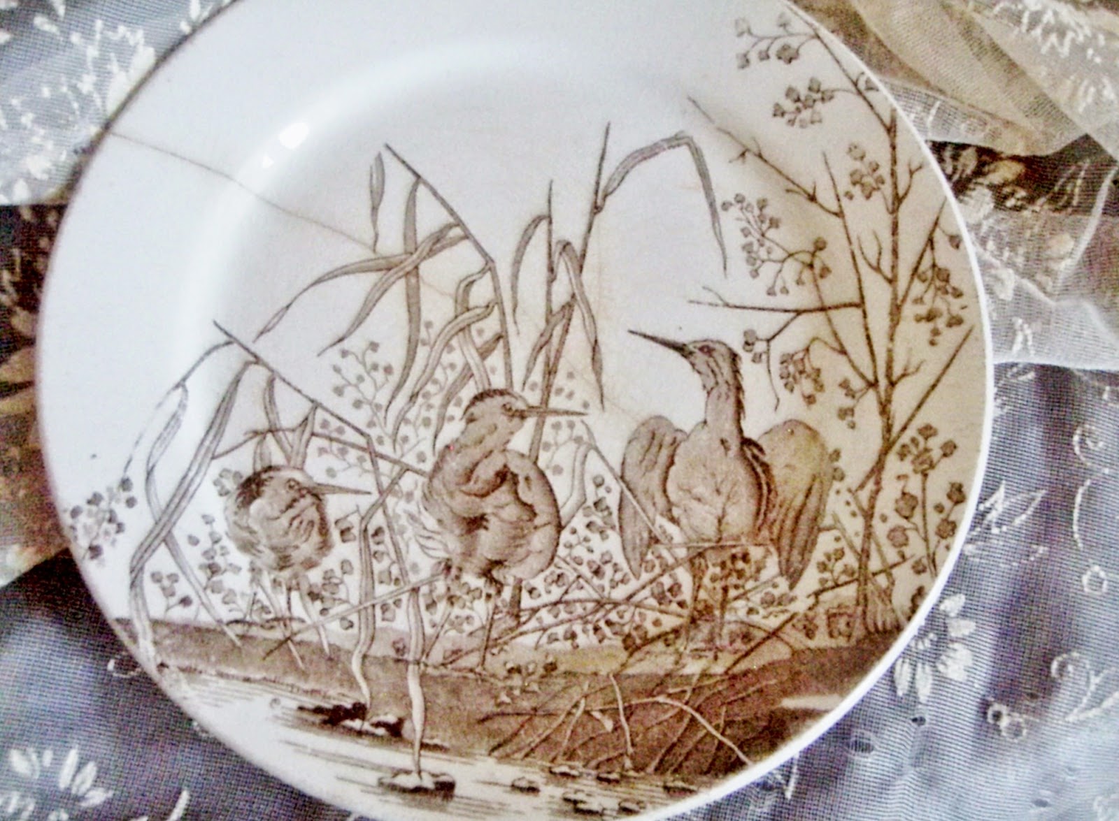 I sometimes feel like I am peering straight through a window of time when I find an old transferware treasure like this one. Old birds on a small plate with a crack running through it that so far no one has ever been able to give up on.