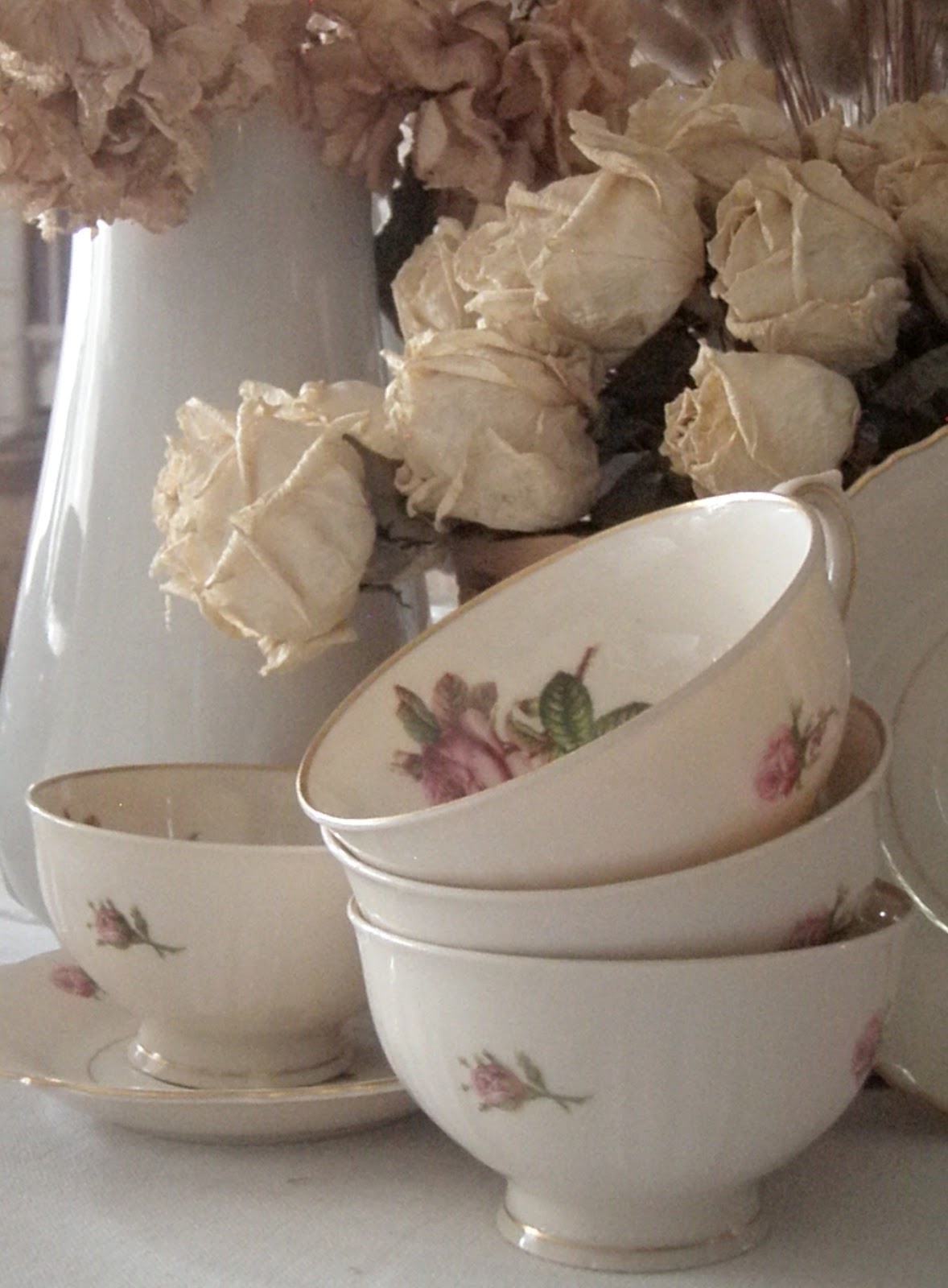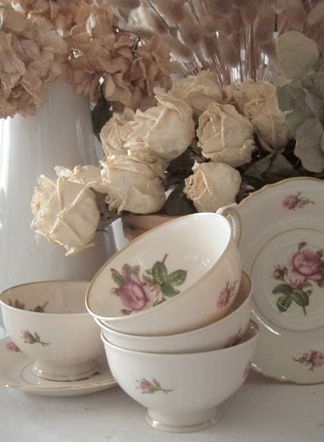 So pretty. I starting hangs my roses to dry this week too, I love them in bouquets, your combined with the beautiful china look spectacular.