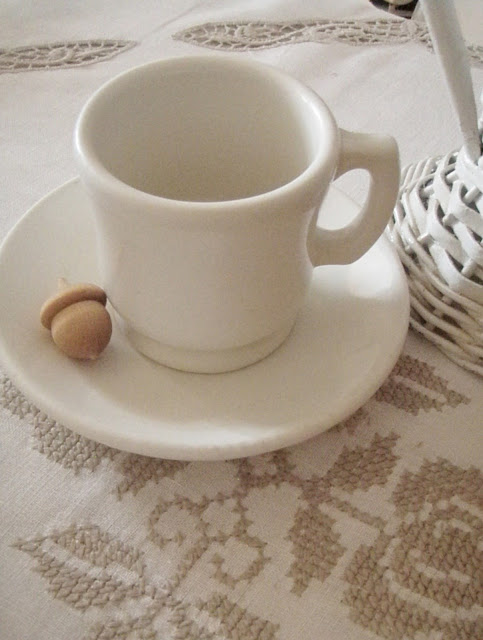 My new found ironstone mug and saucer are all ready for chilly mornings ahead. They make an impromptu vignette with other recent finds that always seem to start out on my dining room table.