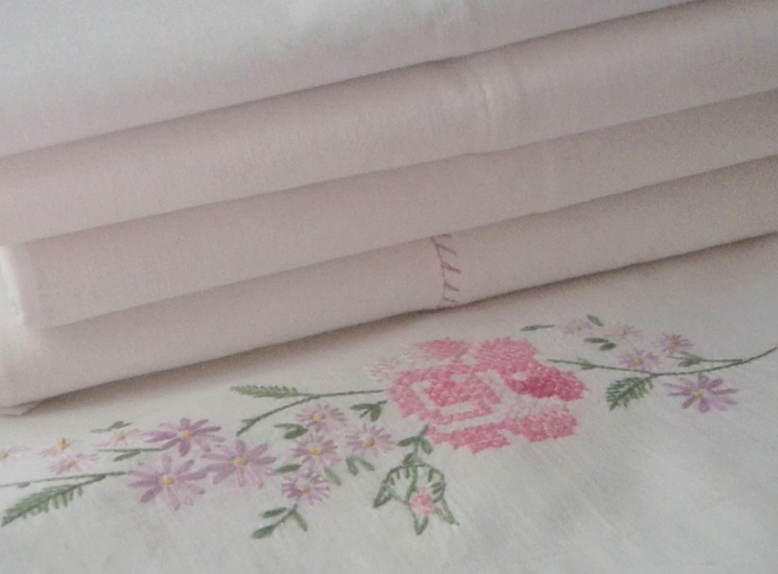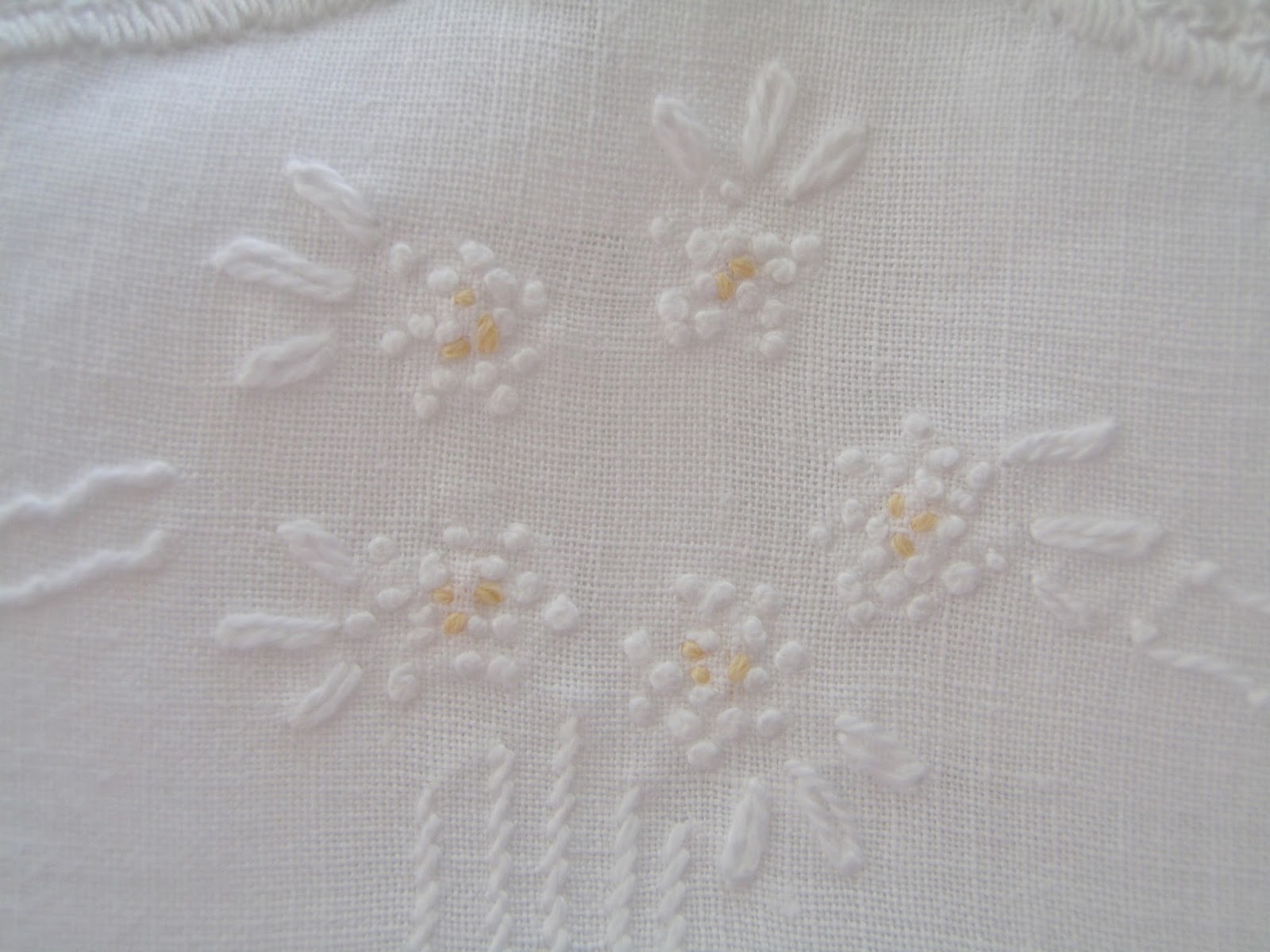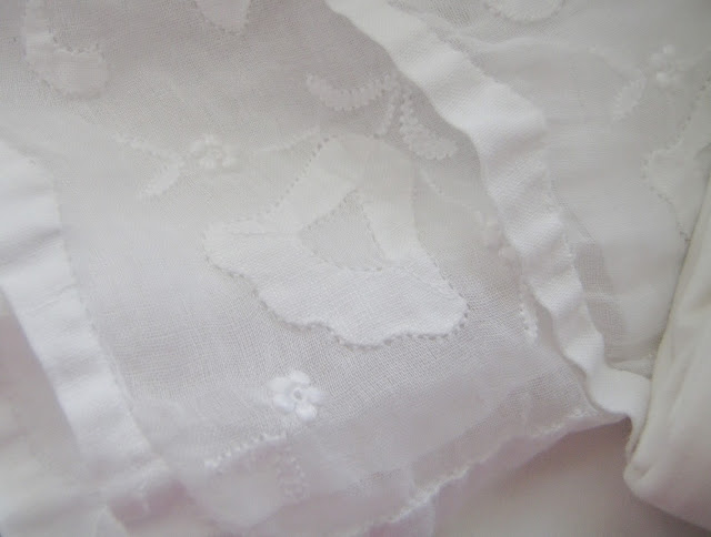 The top folded piece is another pillowcase single. It also has a rarer knitted lace trim versus the usual crochet edge like the one underneath. Any all white pieces work wonderfully together. I wouldn't think twice about gifting a mis-matched pair of beautifully worked vintage pillowcases!