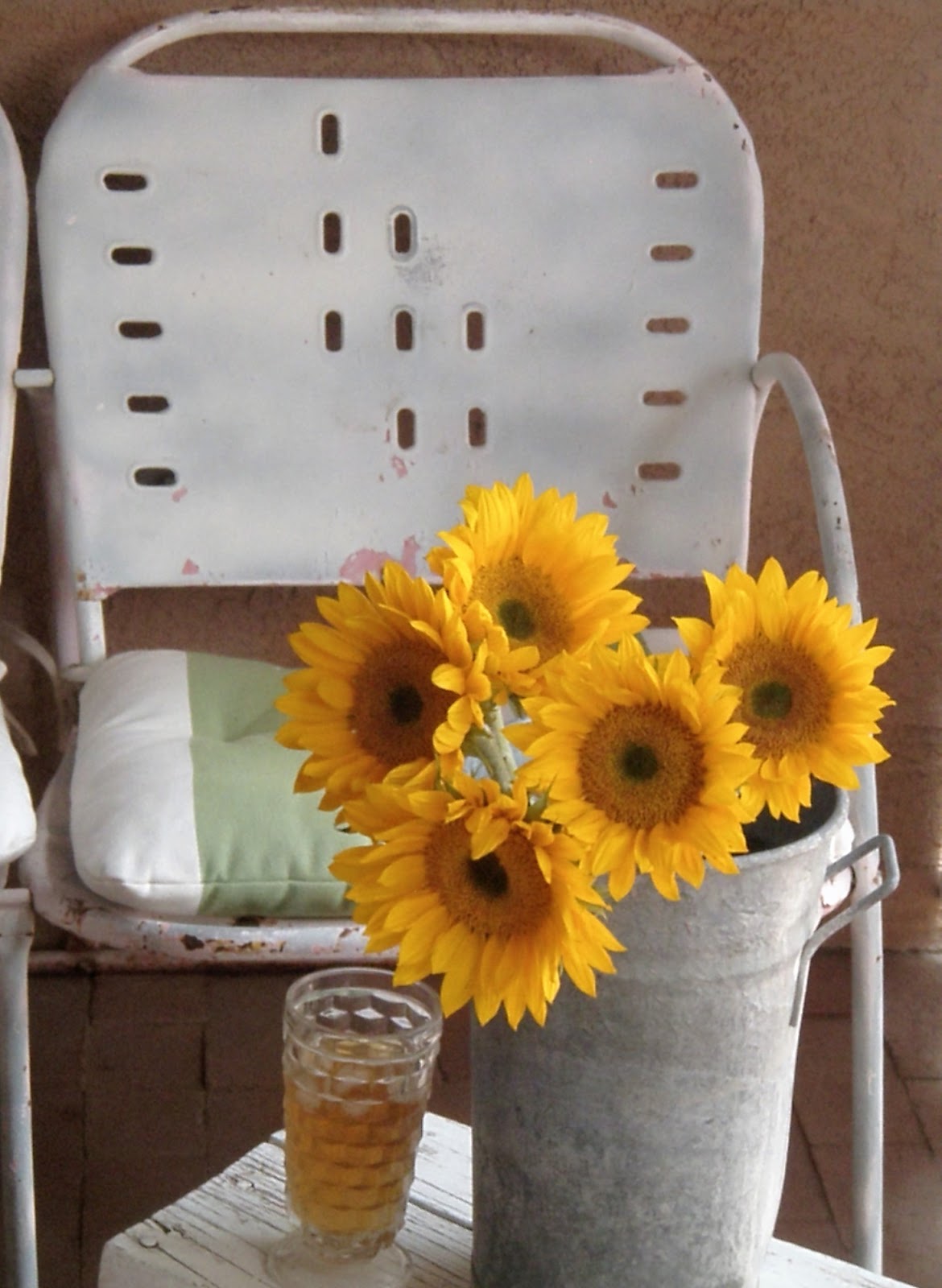 A vacant space like this guest room is a fun place to try out a few things that might not work for me elsewhere. Besides playing with all the vintage bed linens, a host of accessories parade through helping to shape my thoughts on what I want for this room. A bit of blue trim on an enamel pitcher makes it a little extra special, and is perfect for flowers. A bouquet would be the kind of finishing touch I would like to picture here, but I couldn't wait! The teeny stool with the old green and cream paint (which I found only yesterday) is helping me lean toward the colors I want.
