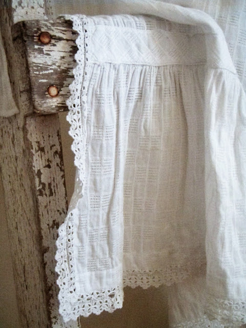 There is plenty of room for more on this chippy old ladder next to the bed, but today she wears a beautiful antique apron that just happened to be standing by. It's just the sort of thing that I love hanging around the place. An antique cotton fabric with old machine lace and a woven counterpane pattern. It has a lovely wide ruffle along the bottom, and just begs for something sweet propped inside the pocket.