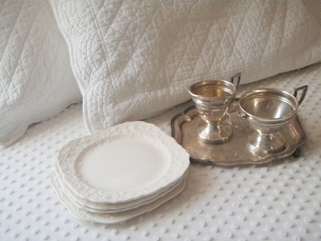 In this case, everything turned up in threes. The silver pieces were sold as a set, and I found a trio of little square plates in one of my all time favorite patterns of white embossed china.