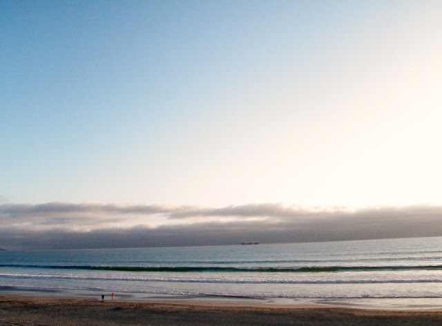 Weather in the eighties on the beach. A beautiful fog was moving in and changed the look of everything by morning.