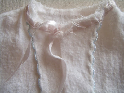 The frayed silk ribbon shows how much this dolly robe was used, and has sweet details even though it's construction is very simple.