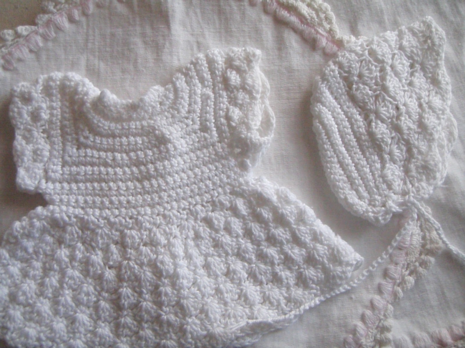 I bought the tiny plastic doll that these crocheted items belonged to just for the clothes. She was in a very bad way and has gone to doll heaven. But the tiny stitches and detail of this work shows how much love (versus money) was once invested into a child's play thing. For scale, the vintage cotton doilies in the background are eight inches!