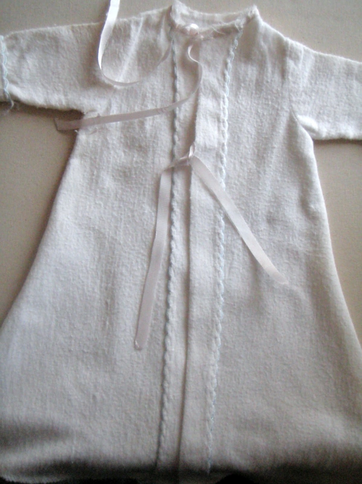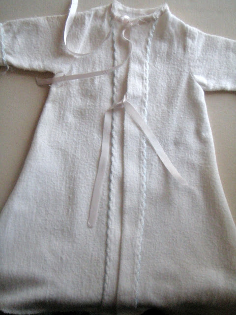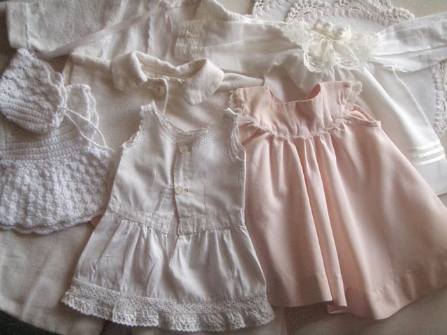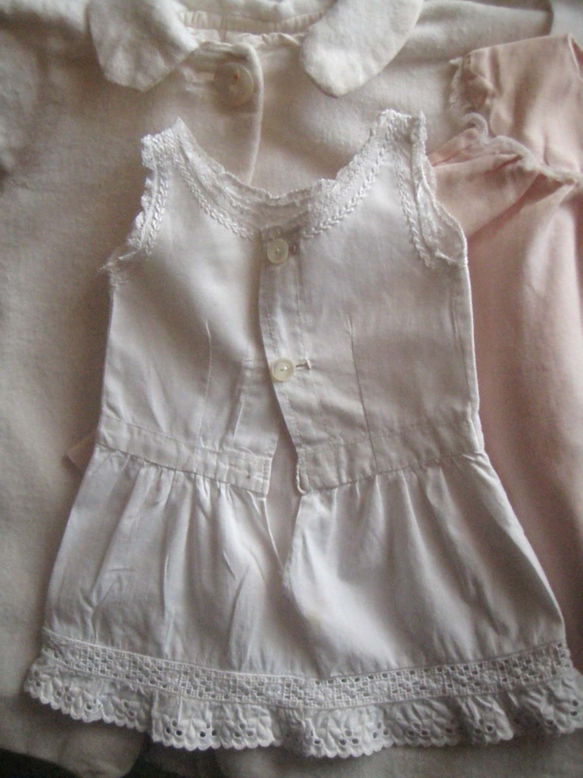 Here are a small flannel coat and robe nicely freshened up. You may notice that I favor white and pastel in my collection. Hunting for doll clothes at flea markets is a bit like searching for a needle in a haystack. But that's a lot of the fun! Besides, when you buy from a doll dealer you pay a far higher price.