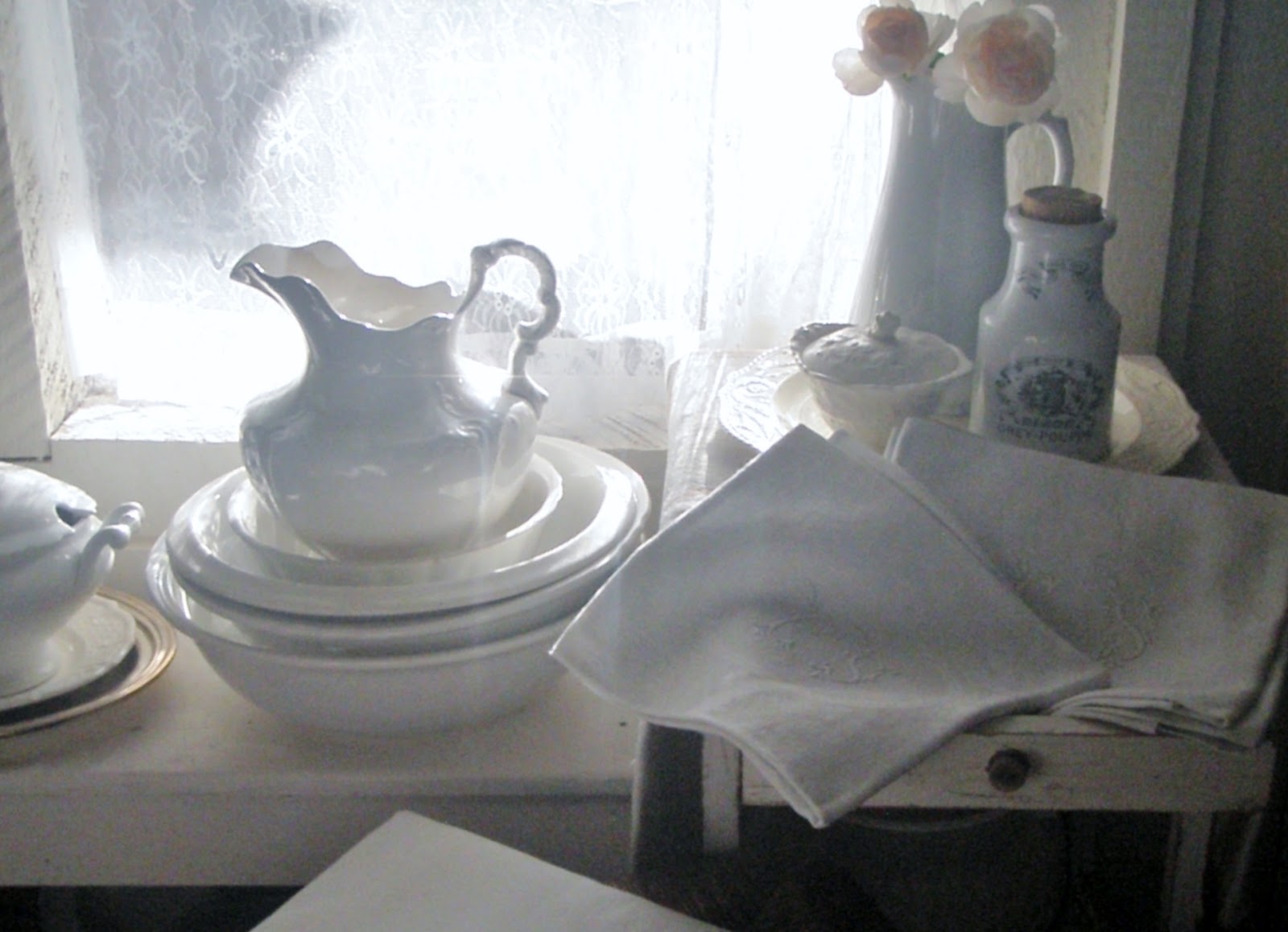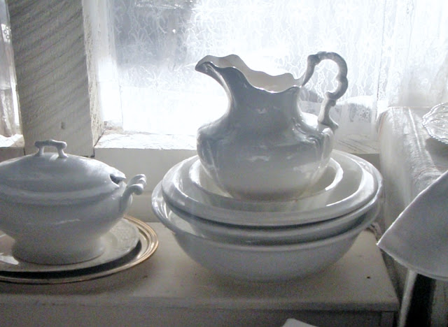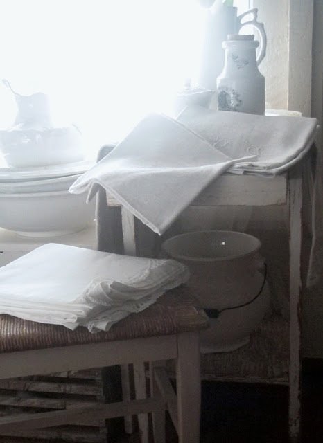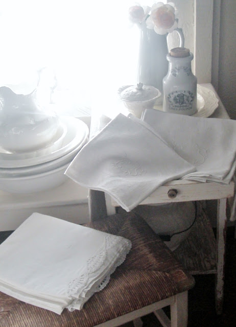 Always a few of my collections hanging out over here too. I won the adorable French rush seat bench at an auction a few years ago. The cotton sheet on top of it came from a fleamarket this summer.