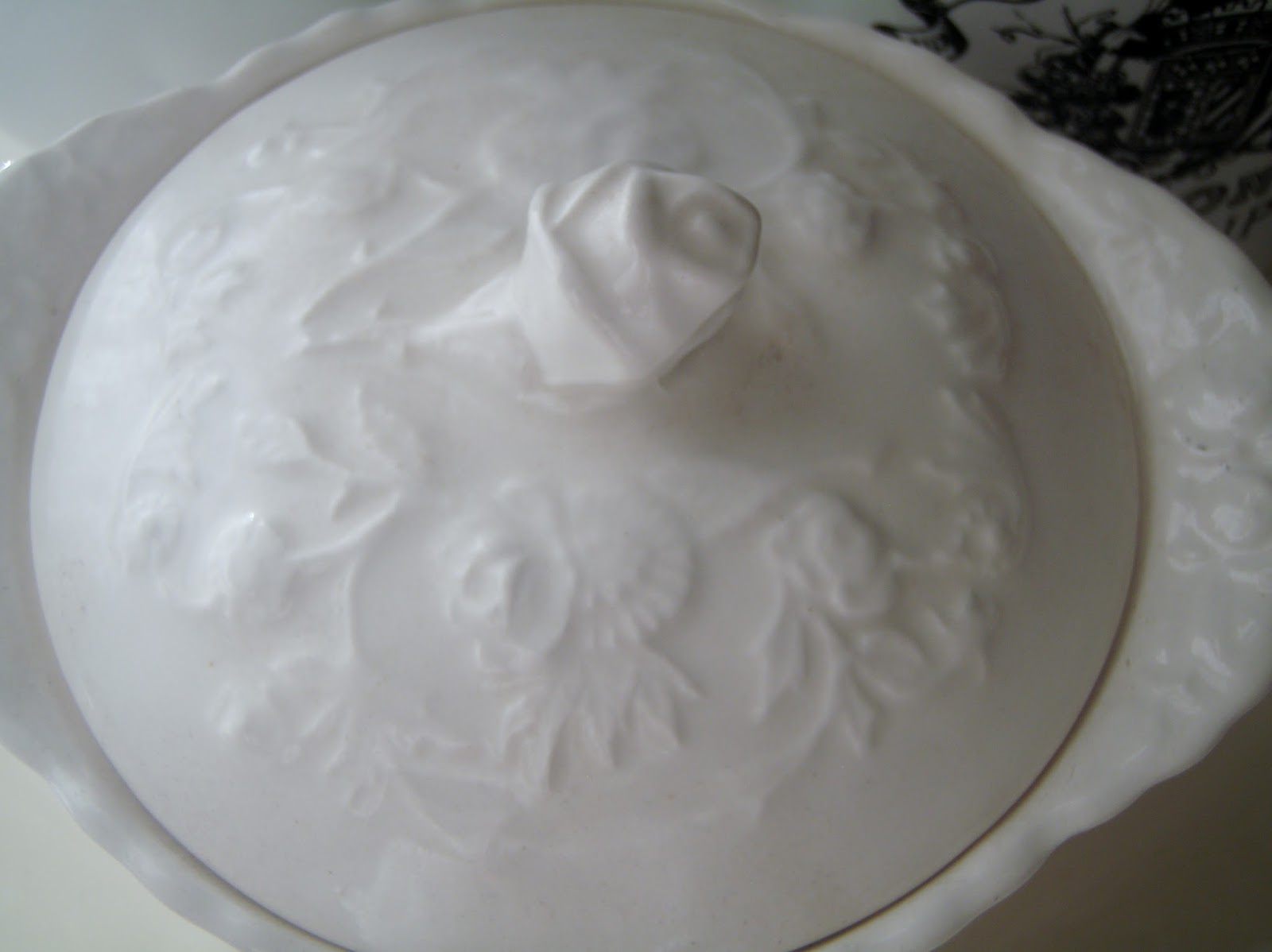 A different rose makes a lid handle on this vintage Rose Point sugar bowl (by Pope Gosser) sweetening things up a little.