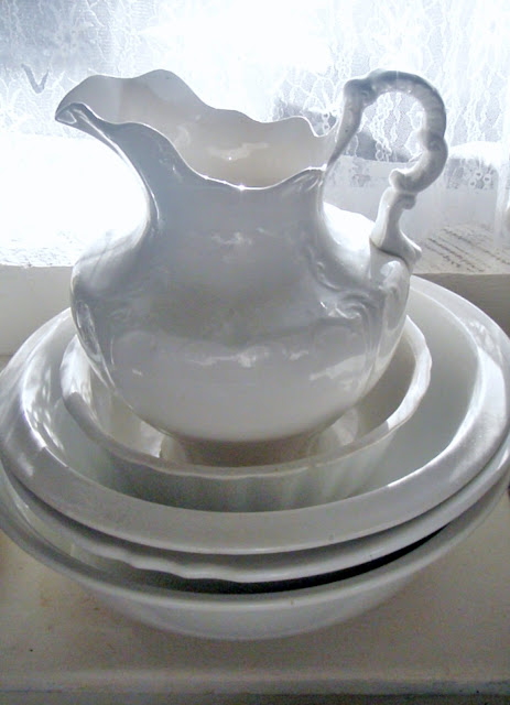 A stack of ironstone bowls on a farmhouse bench makes a nest for an old washstand pitcher.